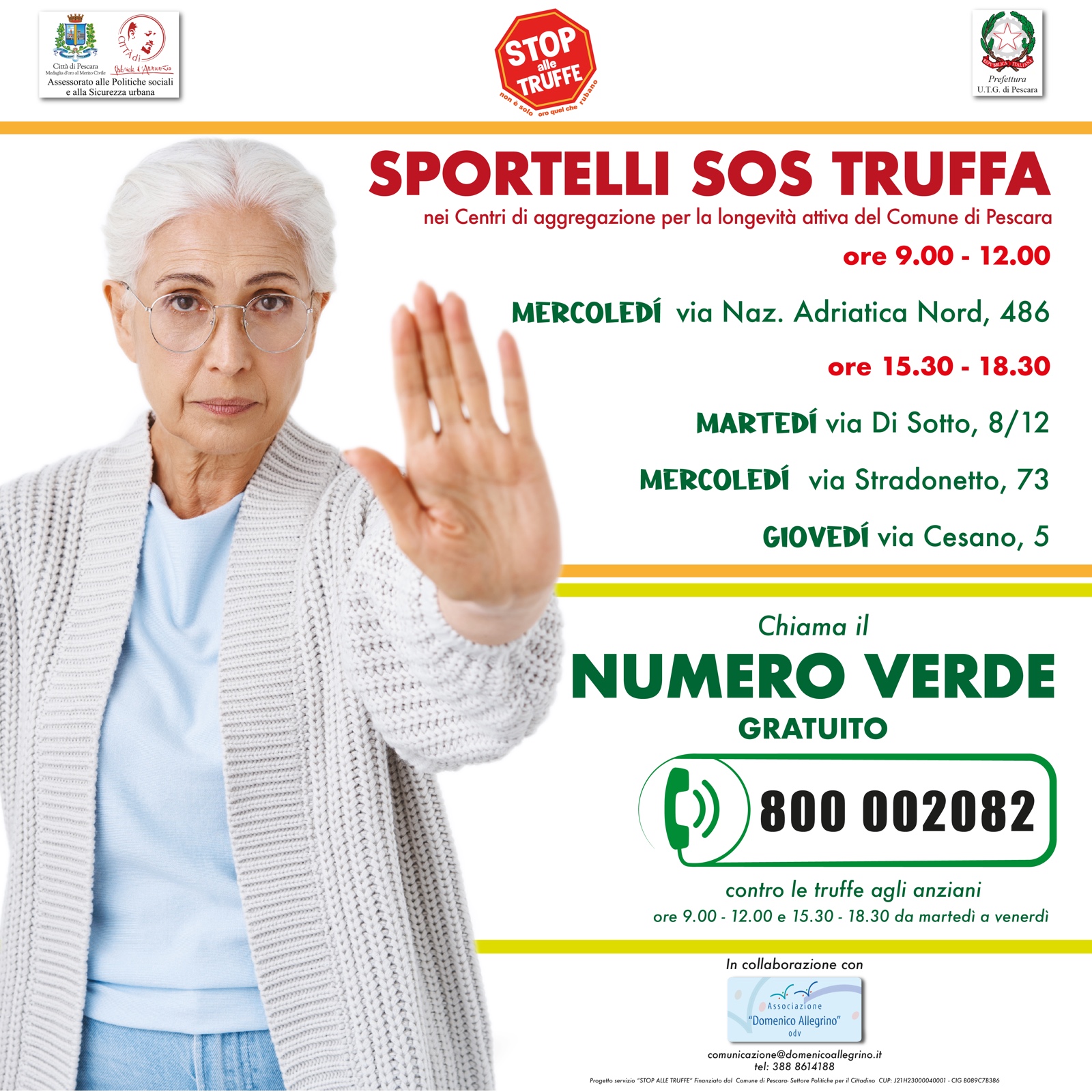 Riparte la campagna di prevenzione e contrasto contro le truffe agli over 65, promossa dall’Assessorato alle Politiche sociali e alla Sicurezza Urbana del Comune di Pescara, finanziata dal Ministero dell’Interno e realizzata dall’Associazione “Domenico Allegrino” Odv.